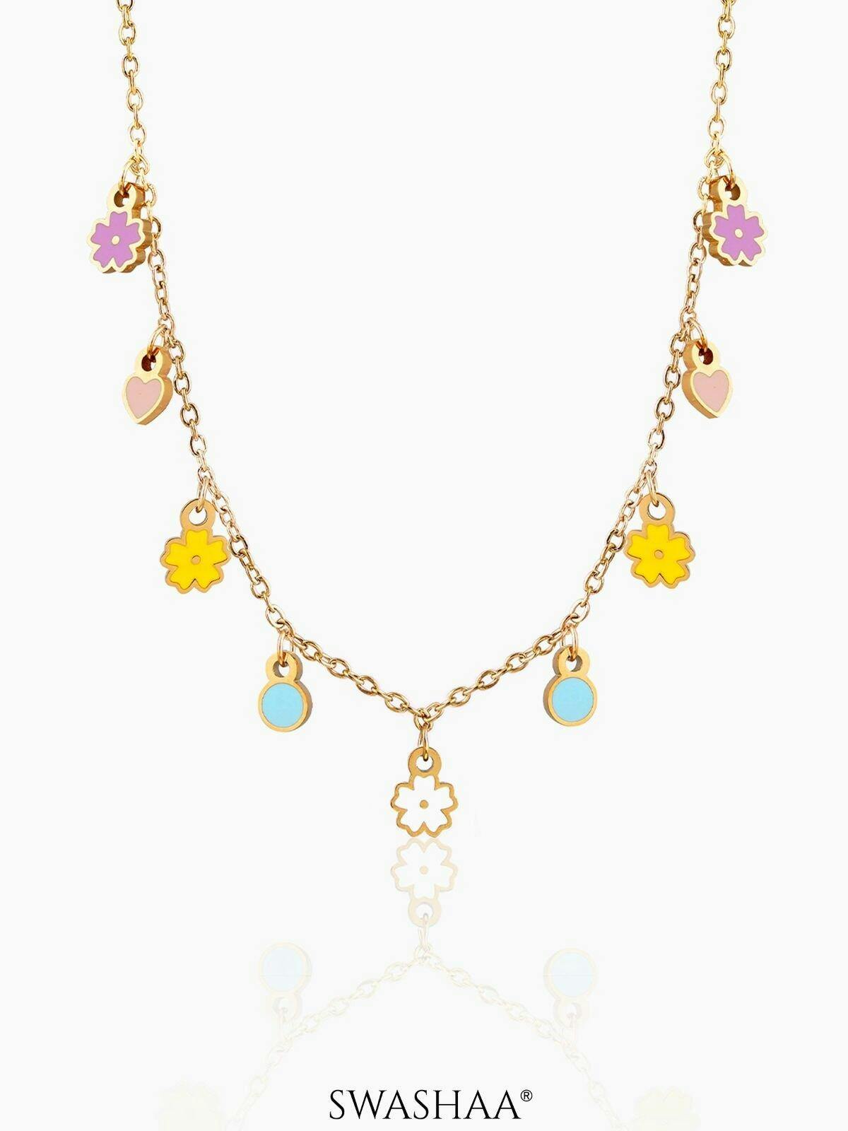 Tiny enamel charms in pastel hearts, flowers, and blue dots dangle from a glossy gold-tone chain. Lightweight and playful, made to move with every twirl and giggle. Perfect for everyday cuteness, party dressing, or gifting a little joy.