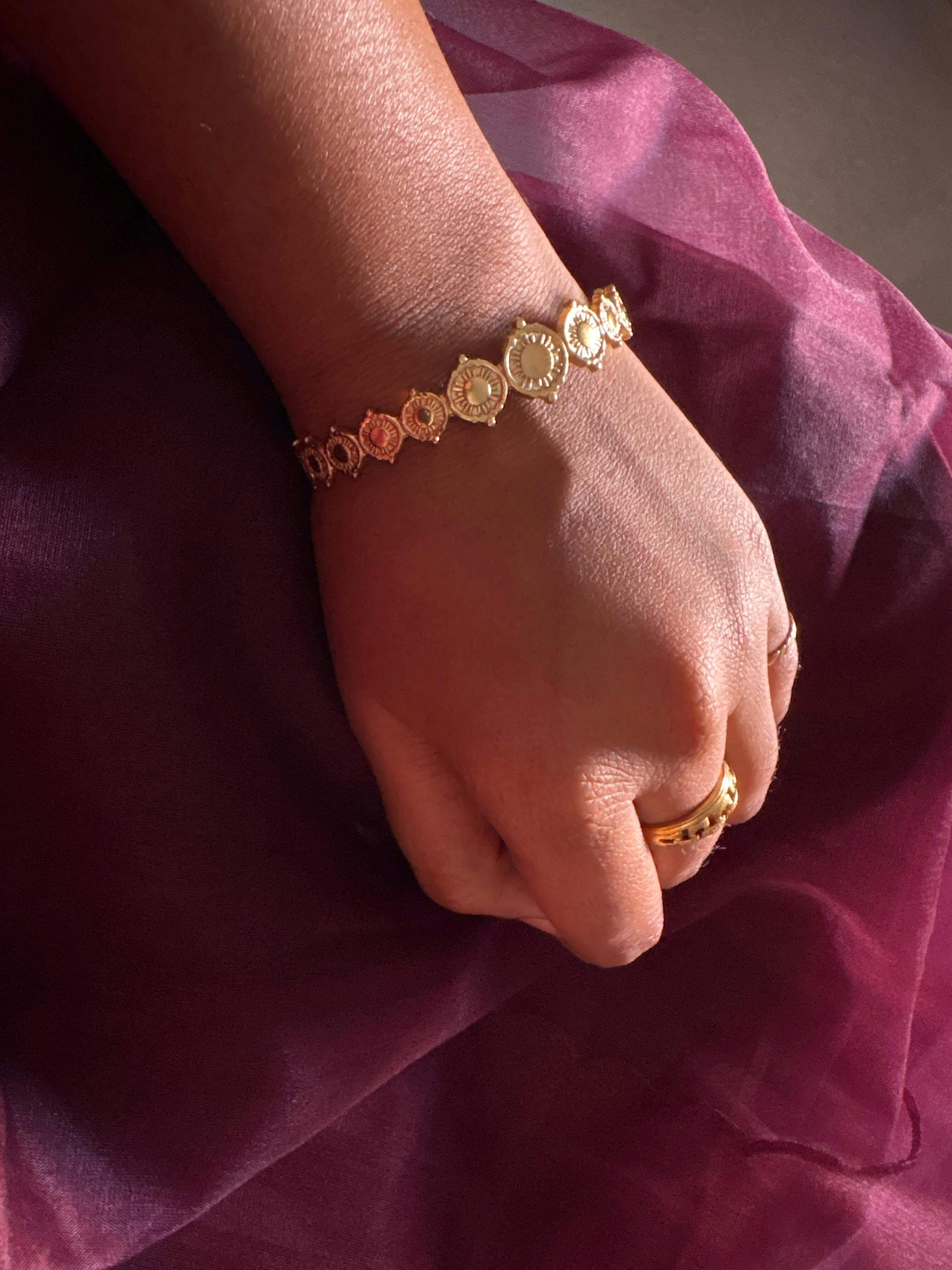 The Veda Circle Texture Bracelet is all about celebrating circles of different sizes and textures that come together to create an elegant and intriguing piece of wrist wear. It's a testament to the beauty of simplicity and the power of tactile design.